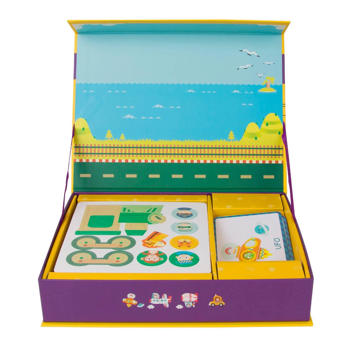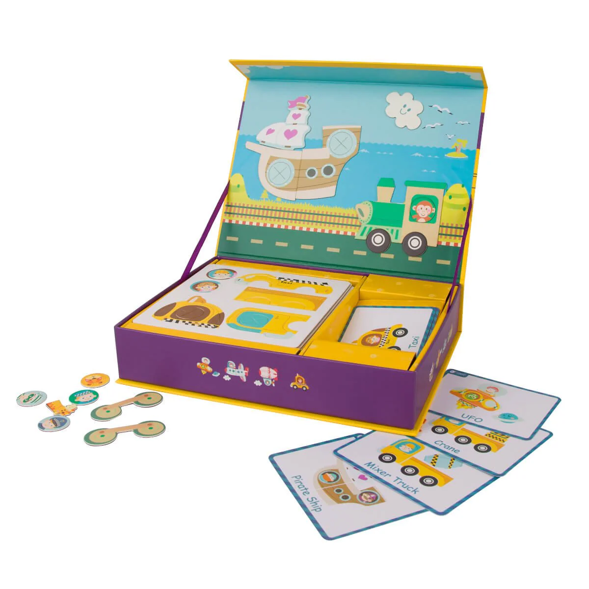 Caja magnética transporte, incluye hasta 12 tipos de transporte los cuales podrás construir uniendo las distintas piezas imantadas, Tu hij@ podrá guiarse por las tarjetas o inventarse distintos transportes