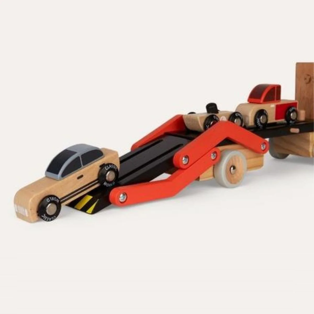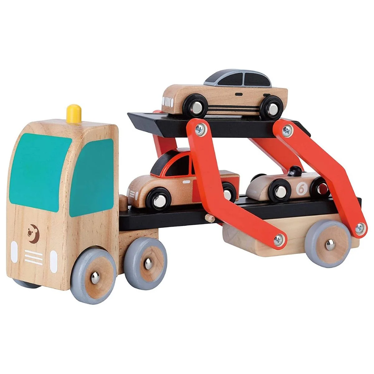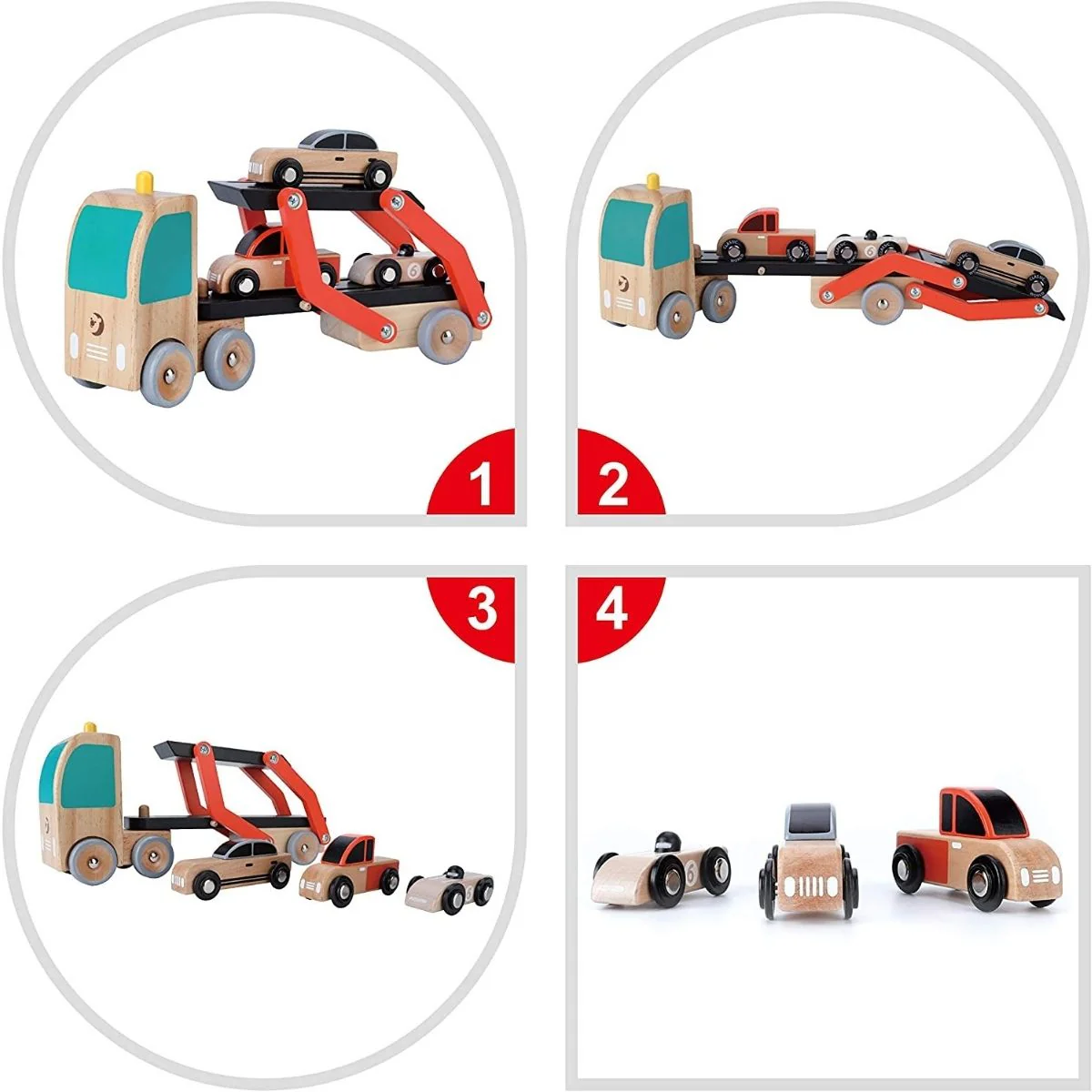 Este juguete de madera imita el proceso de carga y descarga de un camión transportador, Al bajar el nivel, la segunda plataforma funciona como una rampa para que los coches suban al camión, al levantar el nivel, se convierte en un completo sistema de dos pisos.