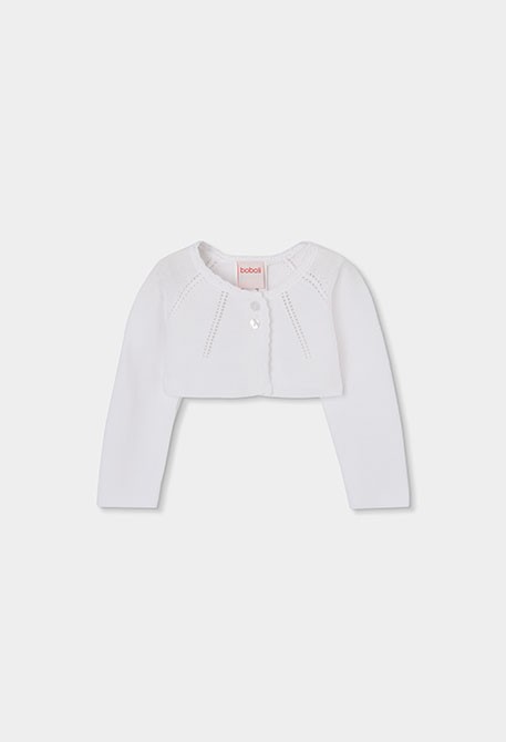 Bolero para bebé niña, confeccionado en algodón blanco, perfecto para ocasiones especiales. El diseño elegante incluye delicados detalles de punto y un cierre de botón, garantizando comodidad y estilo.