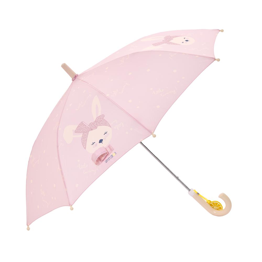 PARAGUAS DE APERTURA MANUAL CON ASA DE PLÁSTICO Y ESTAMPADO CONEJO Y LETTERING. PIEZA CON FORMA DE LIMÓN PARA PONER EL NOMBRE DEL NIÑO.